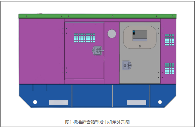 靜音型發電機組外觀如下圖1所顯示。靜音型發電機組與標準型發電機隊的不同之處是發電機組外界裝上隔音罩,消音器內嵌,減少了發電機隊的噪音。這類發電機組適用規定噪聲低的特殊場合,如院校、醫院辦公地址等。